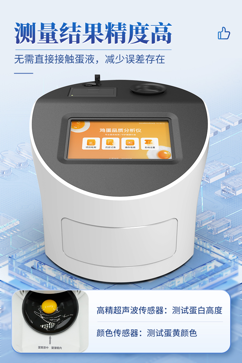 4.創(chuàng)新采用高精超聲波傳感器測試蛋白高度,精密傳感器測試蛋黃顏色,無需直接接觸蛋液,減少誤差存在。