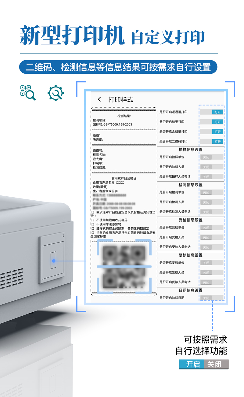 9.7.1、全新打印系統(tǒng):內(nèi)置全新打印機,新創(chuàng)自定義打印方式,可按需靈活勾選控制:二維碼,抽樣信息、檢測信息,受檢信息、復(fù)核信息、抽樣日期、檢測日期等信息的打印。