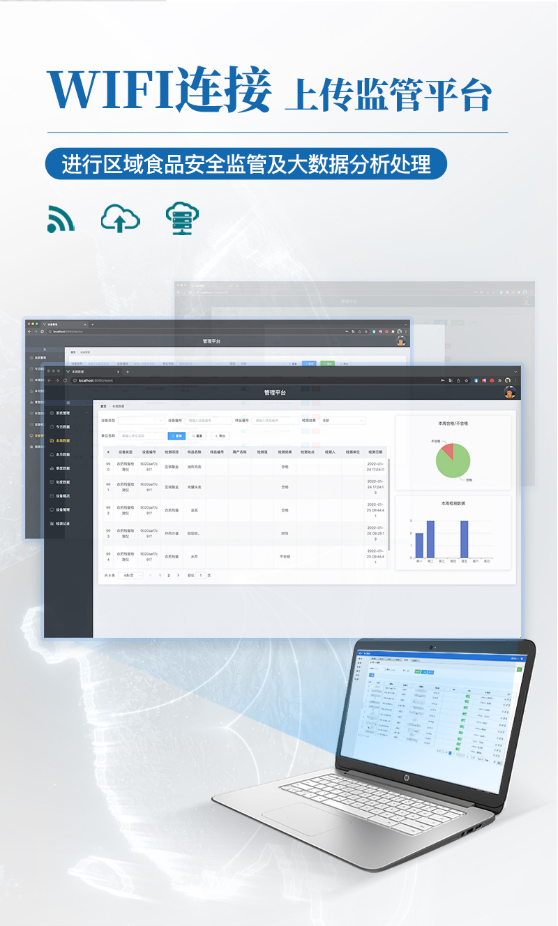 9.6、數(shù)據(jù)監(jiān)管系統(tǒng):同步對接監(jiān)管平臺,數(shù)據(jù)可局域網(wǎng)和互聯(lián)網(wǎng)數(shù)據(jù)上傳,檢測結(jié)果可選擇直接傳至食品安全監(jiān)管平臺。進行區(qū)域食品安全監(jiān)管及大數(shù)據(jù)分析處理與數(shù)據(jù)統(tǒng)計,檢測區(qū)域食品安全長短期動態(tài),達到食品安全問題預(yù)估、預(yù)警。