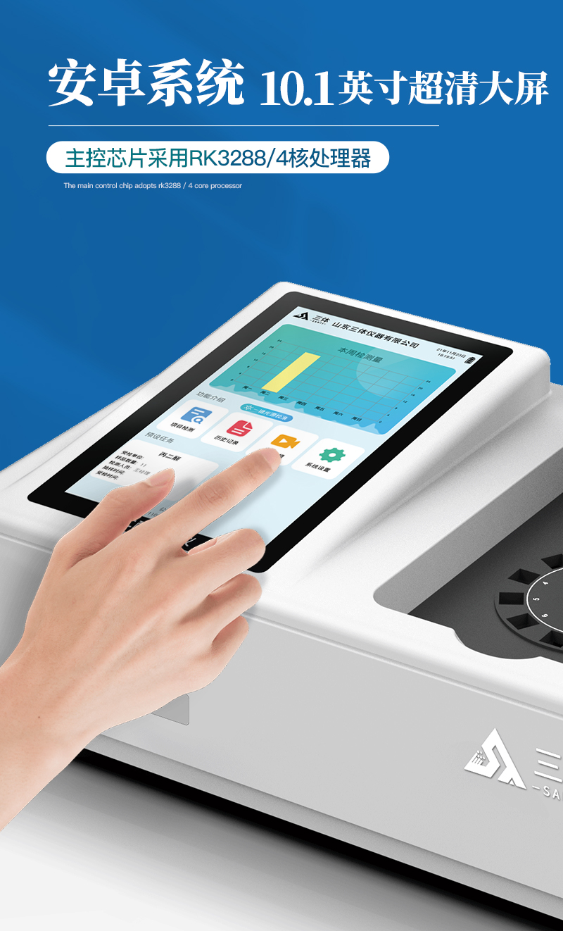 3、顯示屏幕:儀器采用10.1英寸豎向液晶觸摸屏顯,搭配運行安卓智能操作系統(tǒng),主控芯片采用ARM Cortex-A7,RK3288/4核處理器,主頻1.88Ghz,操作方便,性能更強。