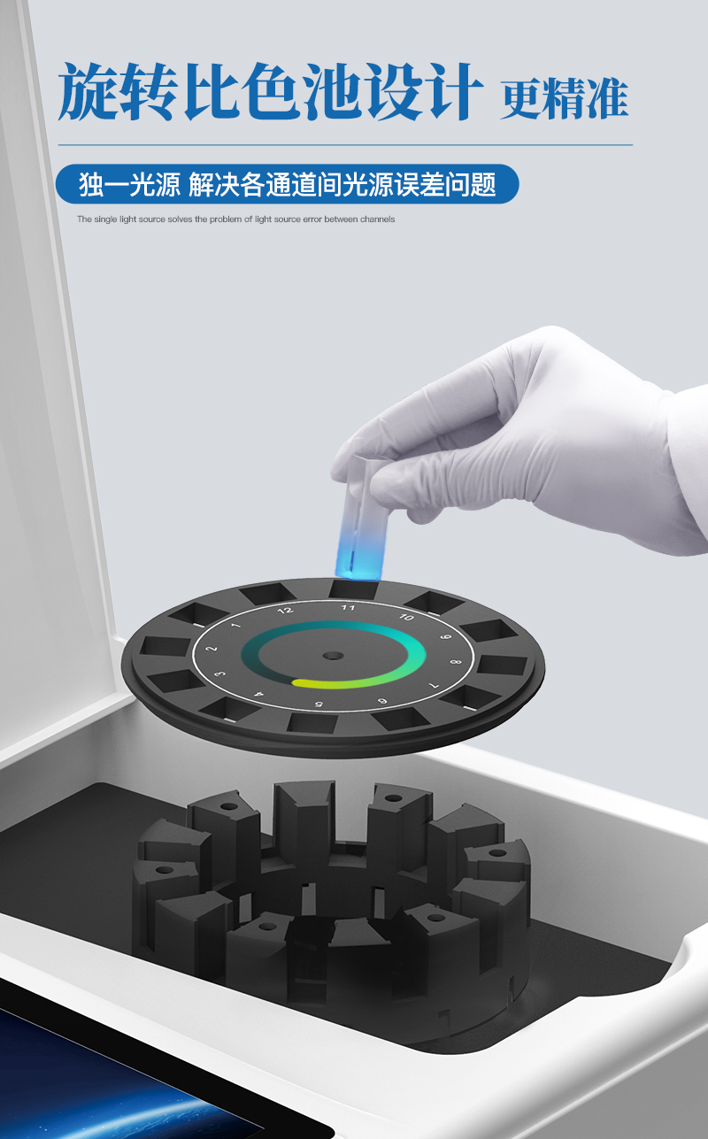 4、檢測通道:≥12通道;采用精密旋轉(zhuǎn)比色池設(shè)計,使用同芯片同光源校準精度,解決不同光源之間的誤差值,更加準確高效。