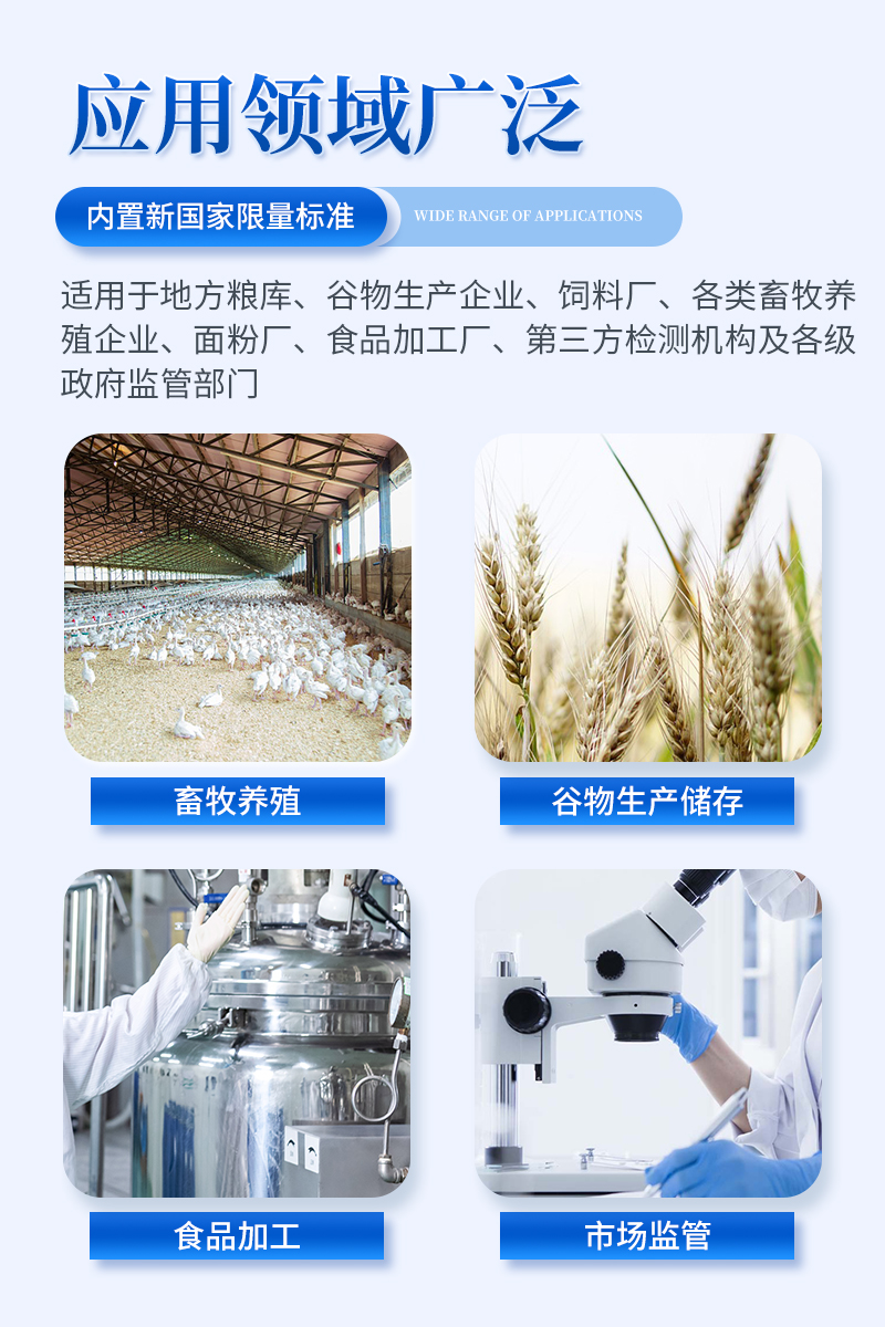 熒光定量真菌毒素快速檢測儀采用熒光定量快速檢測原理,主要檢測糧油谷物飼料中真菌毒素含量,包括黃曲霉毒素B1、黃曲霉毒素M1、玉米赤霉烯酮、嘔吐毒素、伏馬毒素等等,檢測樣品涵蓋糧食谷物(大米、玉米、小麥、大麥、高粱等)及其制品、飼料及其原料、食用油脂、牛奶及其制品等;樣品前處理簡單,整個(gè)檢測過程檢測12min,產(chǎn)品適用于地方糧庫、谷物生產(chǎn)企業(yè)、飼料廠、各類畜牧養(yǎng)殖企業(yè)、面粉廠、食品加工廠、第三方檢測機(jī)構(gòu)及各級政府監(jiān)管部門;
