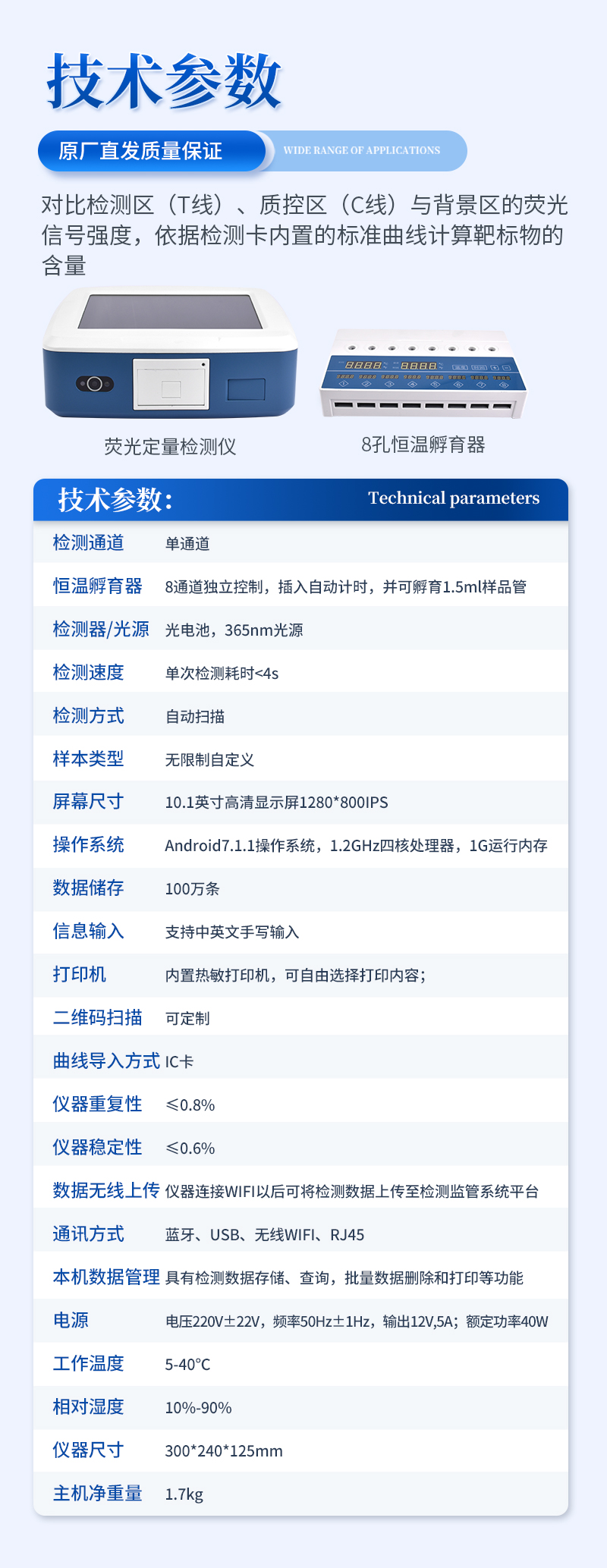 1、檢測原理:熒光定量免疫層析法,對比檢測區(qū)(T線)、質(zhì)控區(qū)(C線)與背景區(qū)的熒光信號強(qiáng)度,依據(jù)檢測卡內(nèi)置的標(biāo)準(zhǔn)曲線計(jì)算靶標(biāo)物的含量;